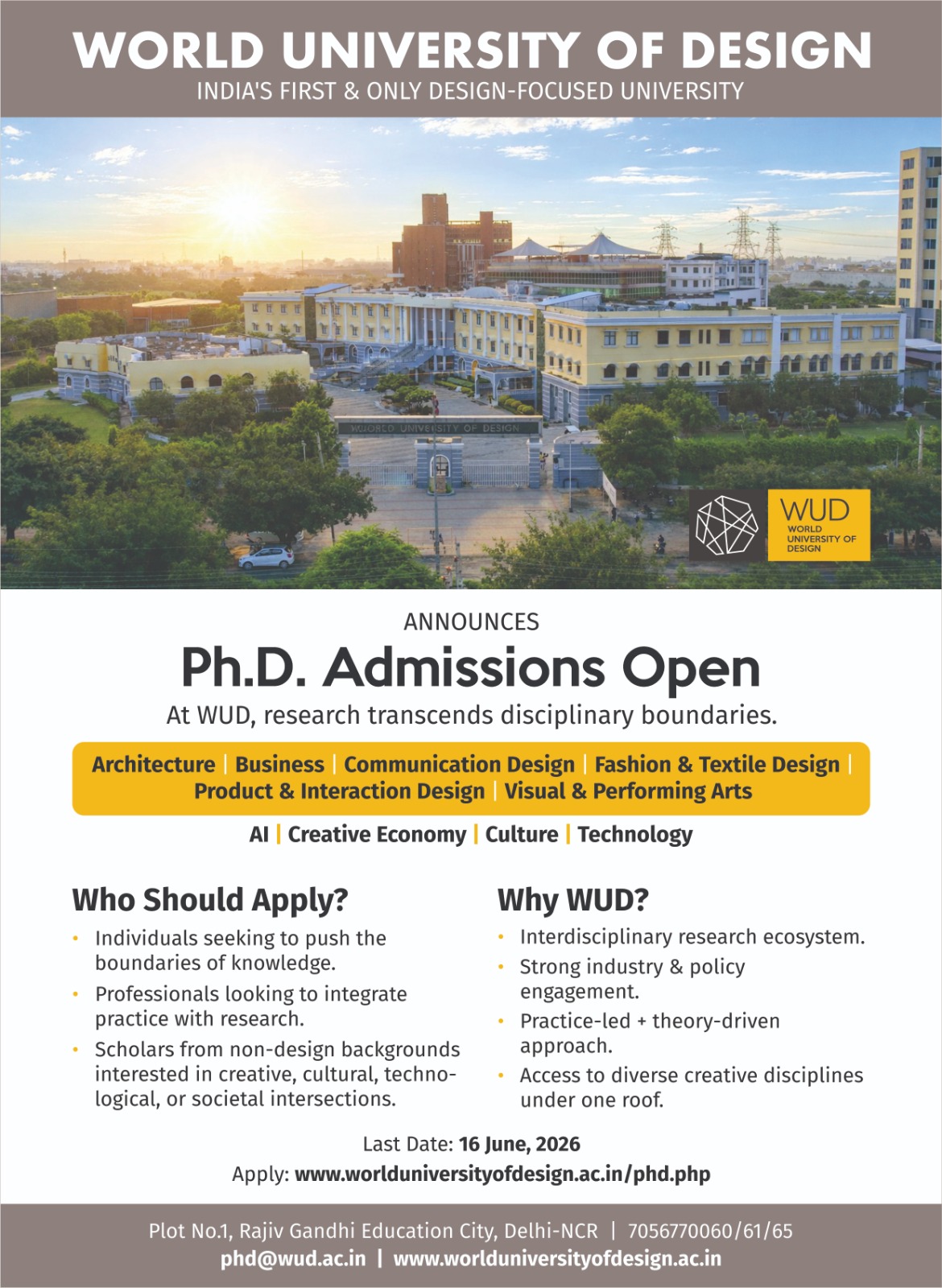 Interested candidates would send in an application along with required documents to the Chair of the PhD program at phd@wud.ac.in. The documentation required consists of –